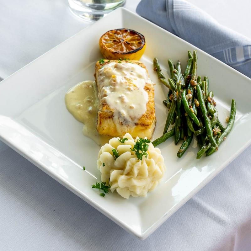 Pan-seared halibut slow-cooked in macadamia butter with herbs, served with two sides.